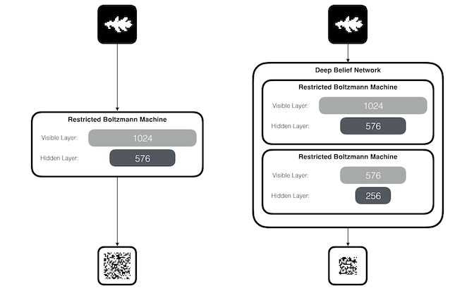 We can also stack multiple RBMs on top of one another to reduce the dimensionality of the patterns even further.